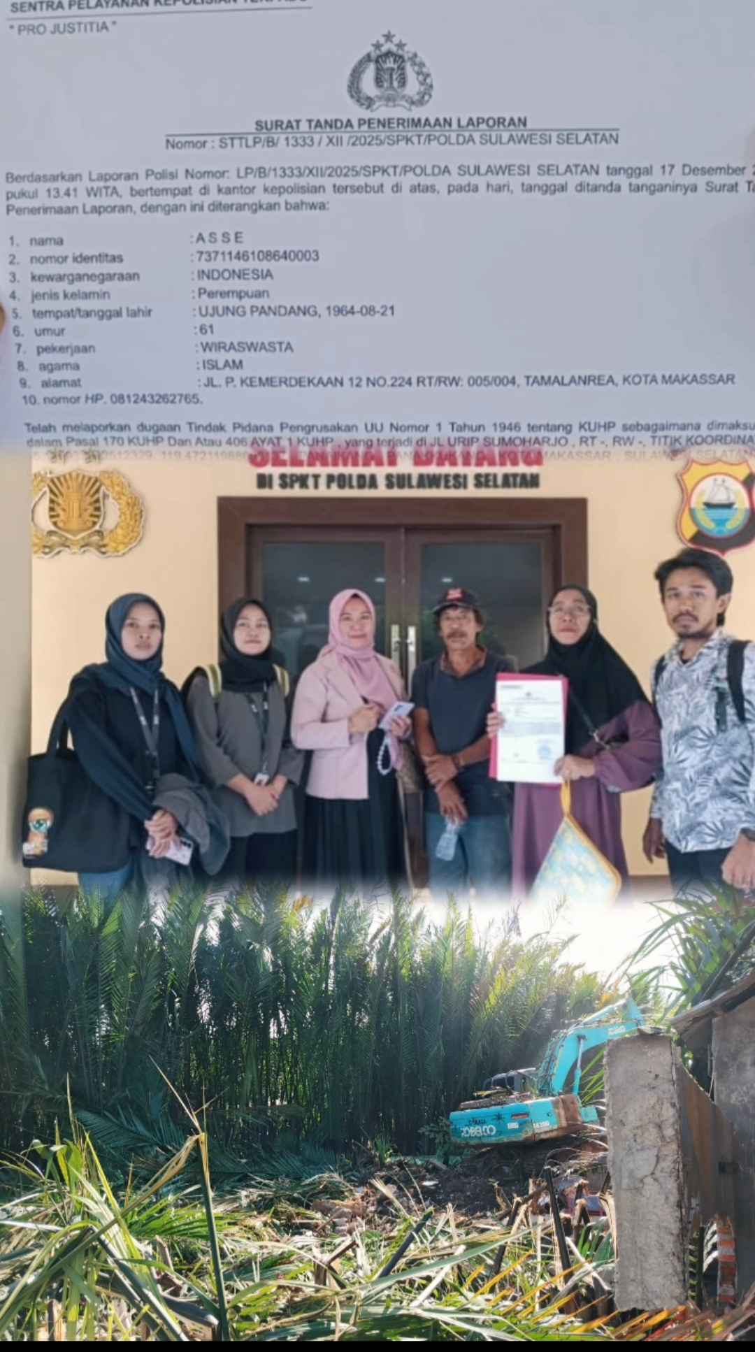 Sebagai langkah hukum yang tegas, pihak ahli waris yang diwakili Hj. Asse telah melaporkan dugaan tindak pidana penyerobotan dan pengrusakan lahan ke Polda Sulawesi Selatan. Laporan tersebut tercatat dengan nomor STTLP/B/1333/XII/2025/SPKT/POLDA Sulawesi Selatan tertanggal 17 Desember 2025, dengan pihak yang dilaporkan adalah: